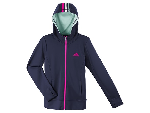 She can zip up this junior jacket on her way to the studio and then throw it on again for post-practice cool-down. Featuring an adidas graphic on the chest and a shaped hood with contrast lining.