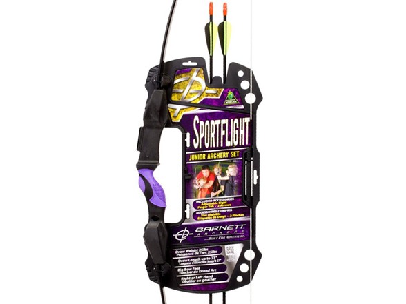 The Sportflight Recurve Archery Set is the perfect kit for introducing young beginners to shooting. The recurve bow has an easy draw weight of 25 lbs., while still retaining that "big bow feel". The soft-touch grip is comfortable in the hand, brightly colored, and ambidextrous. The Barnett Sportflight Recurve Archery Set's packaging doubles as a carry case and includes everything a beginner needs to start shooting.