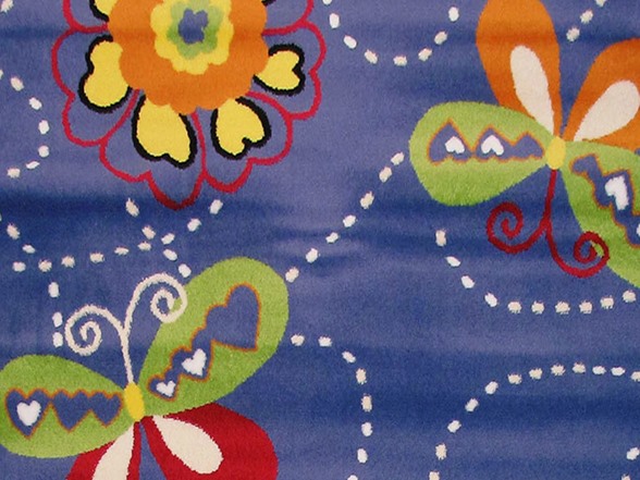 A rug like you’ve never seen before! Don’t be afraid of the dark, enjoy it with this new fun Night Flash design! Will definitely create an exciting atmosphere in your room, so invite some friends over and show them what your rug can do: Glow in the dark!! Adorable butterflies and flowers adorn this colorful rug in the daylight. Multi-colored with blue background. While in the dark, the zig-zagging buzz trail of these butterflies will glow.