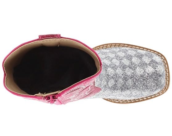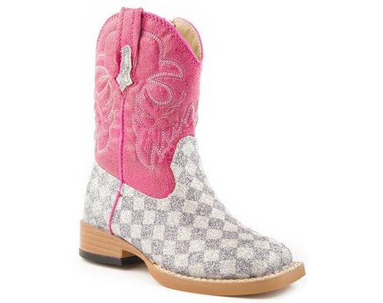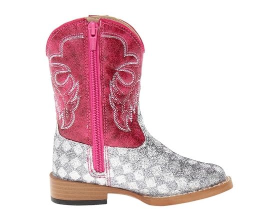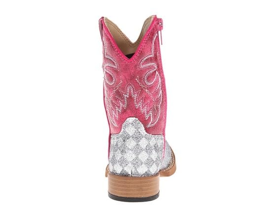 Give your little one something to be happy about with these Glitter Western Boots by Roper! Perfect for the growing cowgirl, these boots are creatively designed with western embroidery and a glitter checkered vamp. The interior has padded insoles for extra comfort and a zipper to make getting the boots on and off easier. Finished off with a stockman heel and square toe, your little one will be nice and comfortable while she learns how to walk.